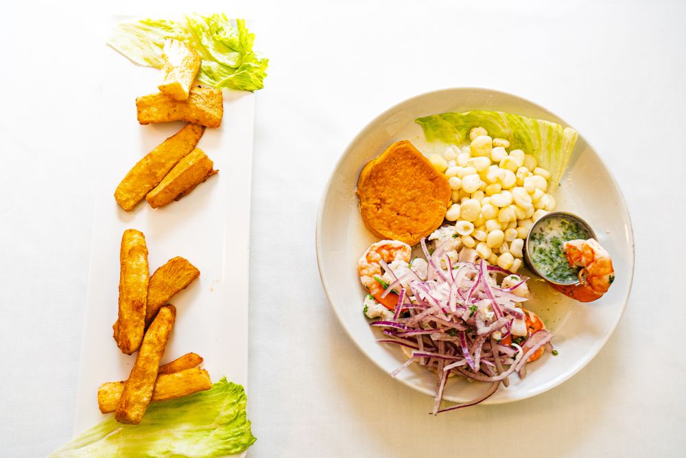 Peruvian seafood platter made with crispy fried fish, shrimp, & calamari, on a bed of fried cassava (yuca). Topped with Peruvian creole onion salad.